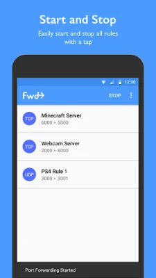 Fwd lets you use your Android device to forward ports over a tethered connection, perfect for hosting servers or opening your NAT type for gaming. This app allows you to use your Android device as a gateway to a webserver, media server or game server (just to name a few).