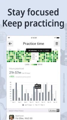 • Upload your own sheet music to the app, and record and practice while watching or following along